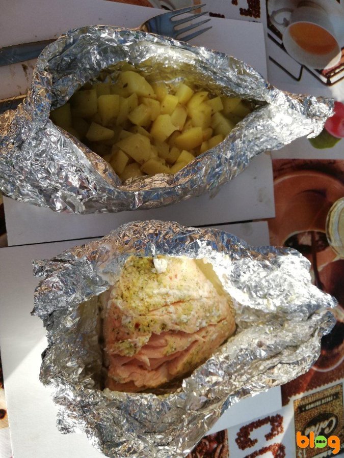 Lososa pokapeme citronem a rukou "vmasírujeme" koření na rybu. Zabalíme do alobalu. Jako přílohu si můžete zvolit cokoliv, my jsme nakrájeli brambor na kostičky a udělali je také v alobalu s kořením.